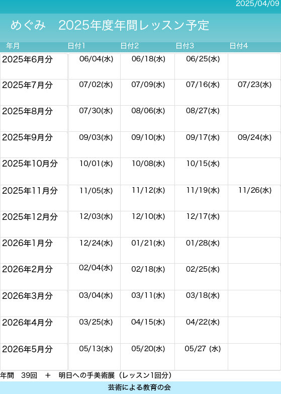 | その他 | 幼児コース スケッチブック(八つ切) 880円 保険料、展覧会出品料、スケッチブックなどの教材費など。 また、陶芸、木工制作など、イレギュラーでかかった材料費を 別途徴収する場合があります。 年に一回展覧会へ出品します。(レッスン1回分です) |
