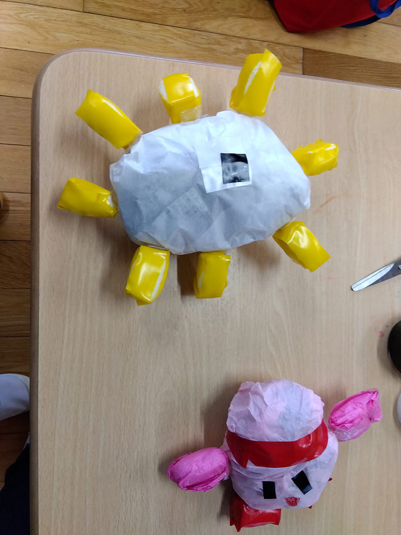 新聞紙などのかみをくしゃくしゃにまるめて、テープやおりがみをつかって飾っていきます。おもしろキャラクターがたくさんできあがりました!