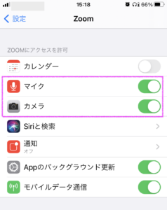 設定> Zoom > マイクとカメラがオン(緑色)になっているかご確認ください。