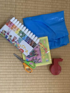*ビニール袋がご用意できなかった場合はバスタオルでも代用できます↓以下はそのバージョンの下準備をご紹介します。バスタオルという、身の回りの体を拭くという機能を持った「もの」が今回はちょうちょに変身するという「工作の素材としての新しい出会い、別の見方、新たは発見」になっています。別の機能として「もの」を体感することは、物事を違った視点から見る、考えられるスキルを育むことを養います。