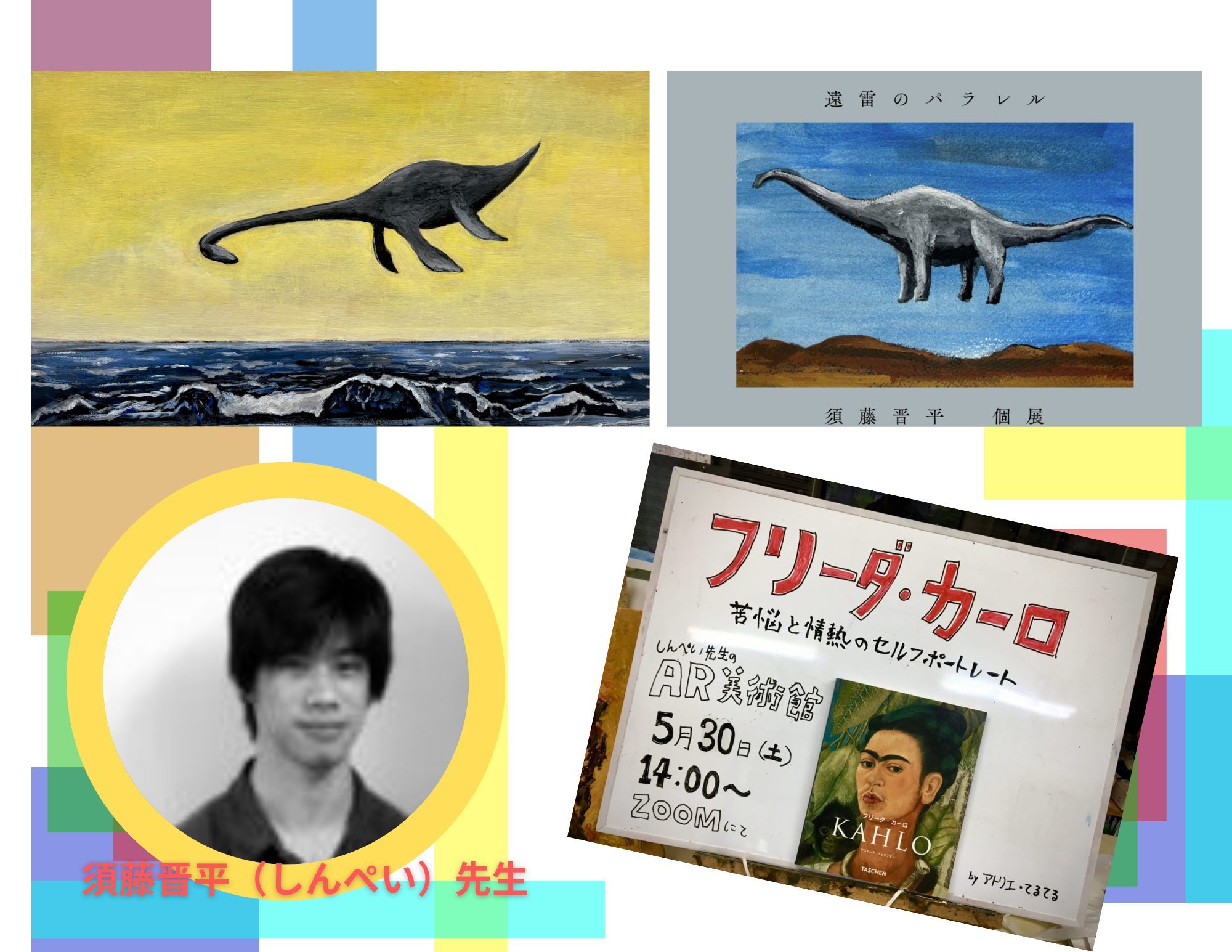 子どもたちの感じる力・表す力を育てていきます。あの大人気企画AR美術館企画担当、恐竜などをモチーフに作家活動をしている(美術、恐竜にお詳しいです♪🎓)オンライン絵画コースの須藤晋平先生(多摩美術大学大学院博士前期課程油画研究領域修了)も参戦!