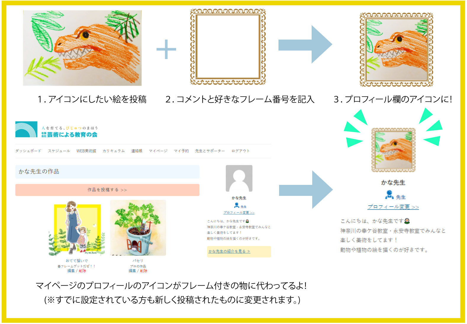 コメント欄に欲しいフレームの番号とアイコンにしたい絵のコメントを載せると後日、投稿してくれた絵に選んだフレームがついたマイページのプロフィール欄のアイコンに変更されているよ!