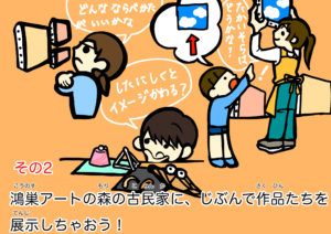普段、web美術館でコメントをくれる憧れの美大生アートフレンズの作品を実際に鑑賞できたり、お子さま達の持ち寄った作品を古民家・森に展示しながら、この日だけの美術館を一緒に作り上げていきます。