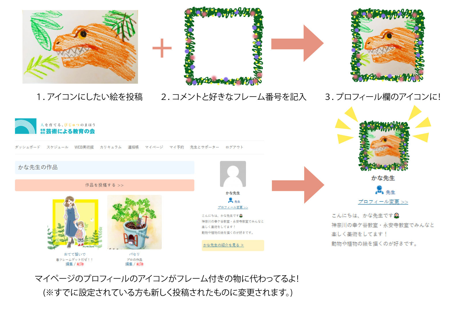 コメント欄に欲しいフレームの番号とアイコンにしたい絵のコメントを載せると後日、投稿してくれた絵に選んだフレームがついたマイページのプロフィール欄のアイコンに変更されているよ!